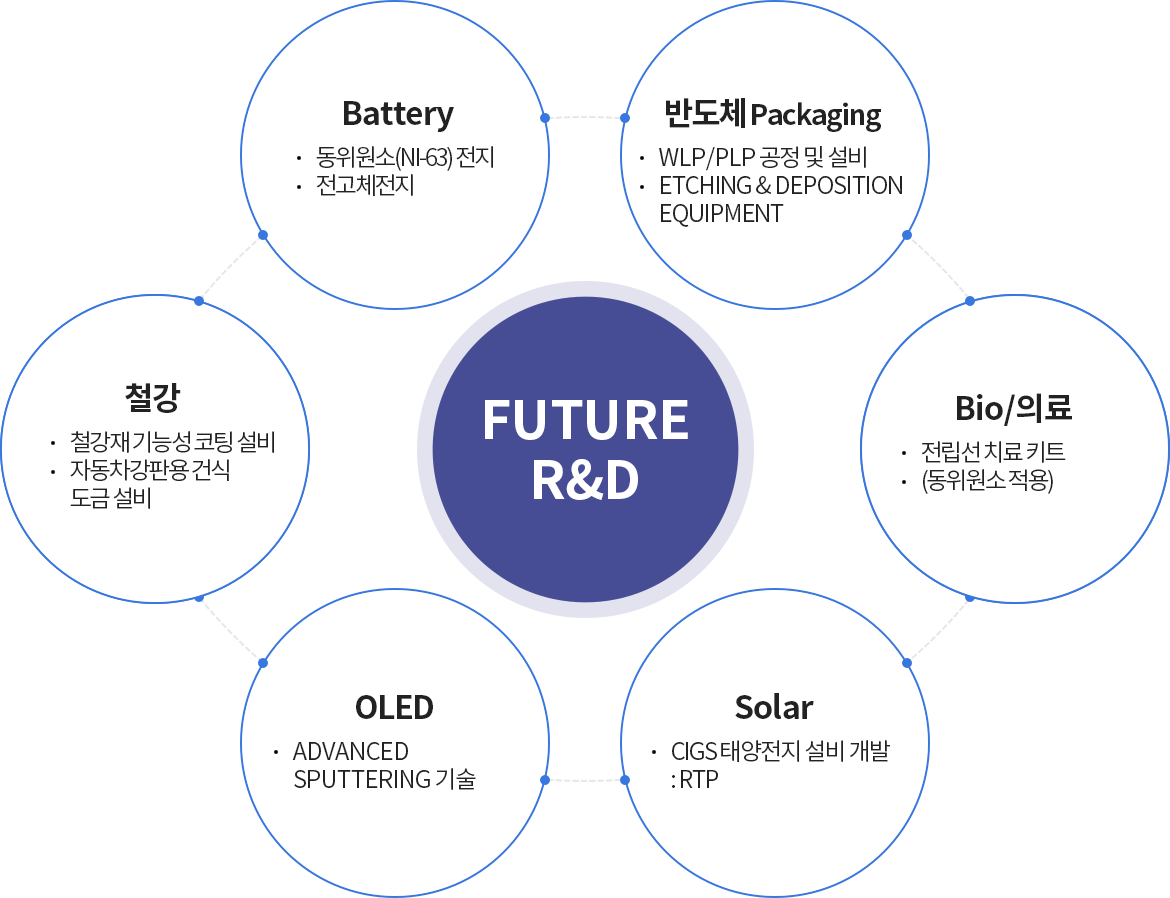 - Plasma Monitoring 및 두께 제어, TFT Active Layer 특성 검사, 자기부상 반송, Hybrid 운영 System, 하지막 Low Damage 증착기술(Microwave 적용)